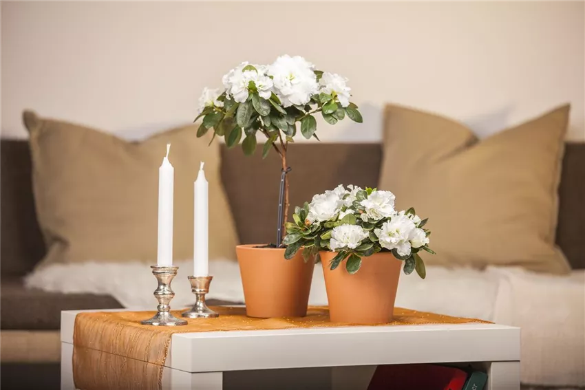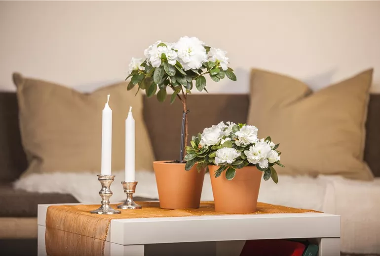 Von den pflanzlichen Mitbewohnern möchte ausgerechnet die Azalee im Zimmer viel trinken. Ihr Name bedeutet „trocken“, obwohl sie ohne genügend Wasser nicht existieren kann. Das soll man der pflanzlichen Diva bitte regelmässig zuführen, und sie hätte es gern gleichbleibend feucht. Dabei bevorzugt sie kalkfreies Wasser; von Regenwasser ist sie geradezu begeistert. Auch zu den Wärmeverhältnissen hat sie klare Vorstellungen. Bei 18 Grad hat die Azalee im Zimmer ihre Wohlfühltemperatur. Ein Aufenthalt im Wintergarten gefällig? Da sagt sie nicht nein. Sie möchte hell stehen, aber nicht direkt der Sonne ausgesetzt werden. Alle Wünsche erfüllt? Die Belohnung erfolgt mit wundervollem Blütenzauber zwischen November und März.