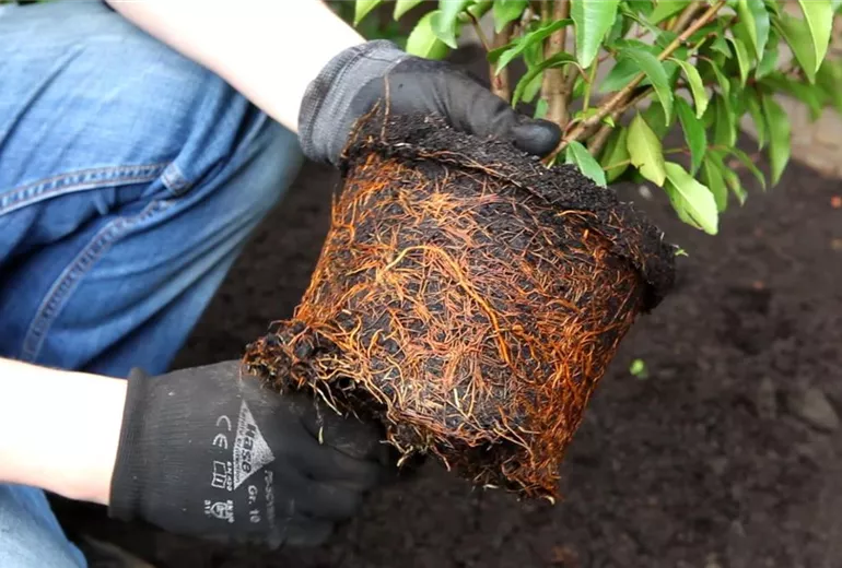 Falls sich in dem Topf bereits Unkräuter angesiedelt haben, sollten Sie diese selbstverständlich entfernen. Vor dem Einpflanzen können Sie den Wurzelballen etwas auflockern und noch einmal durchdringend wässern.